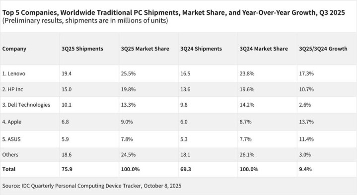 根据国际数据公司(IDC)发布的最新报告显示,全球个人电脑(PC)市场在2025年第三季度保持稳健复苏。报告显示,本季度全球PC总出货量达7580万台线上股票配资开户,较2024年同期的6930万台增长9.4%,行业整体呈现扩张态势。这一增长主要得益于Windows 11升级周期与老旧设备换新潮的持续推动。